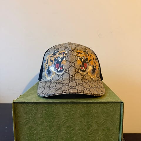 Gucci keps i beige med mönstrat tyg. Kepsen har ett justerbart bakstycke i mesh-material för ventilation. Designad för allmän användning.