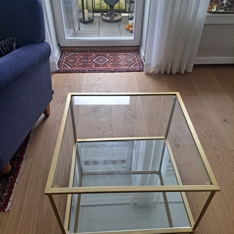 Mycket stadigt, tungt glasbord (65x65cm höjd. 43cm) med metallben. Kan användas som sidobord eller litet soffbord. Glasskivan i härdat glas, ca.1cm tjock. Under bordsskivan en svart mönstrad glashylla för tidningar etc.
