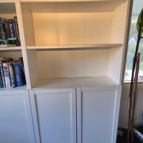 Vita bokhyllor med luckor. Billy/Oxberg med nya metallknoppar. En dubbel och en enkel. Dubbelskåp: 80*30*106 cm, enkel 40 cm bredd. Knappt använt. Båda för 800kr monterat och klart. Nypris drygt 1300kr.