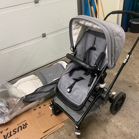 Bugaboo duovagn i svart färg. Vagnen har en liggdel och en sittdel. Medföljer regnskydd, extra röd sufflett och mugghållare.