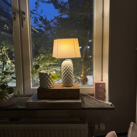 Stämningsfull lampa av saltsten med träfot. Lampan ger ett varmt och behagligt sken. Höjden är cirka 18cm, och D. 10cm