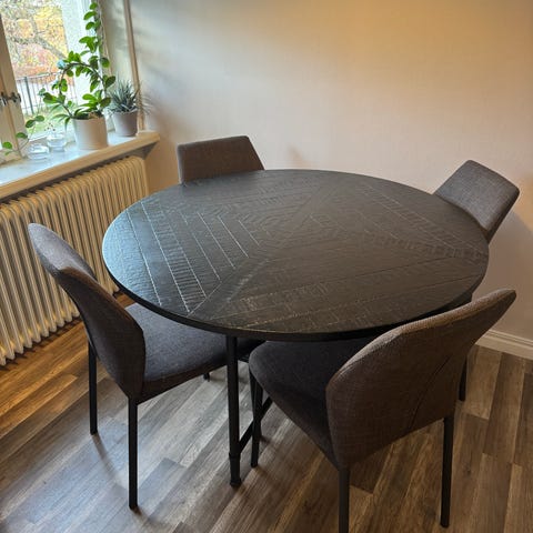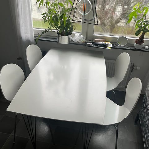 Matbord säljes med 4 st tillhörande stolar i väldigt bra skick. Bordet är vit till färgen 120x75 och kan öppnas och bli 160. Sittdynor till stolar ingår.