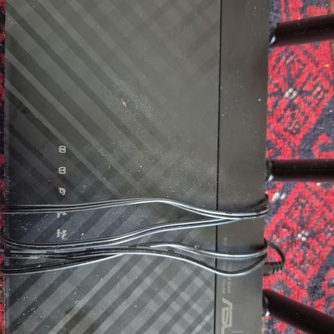 Asus trådlös router med fyra externa antenner och medföljande nätadapter. Enheten är avsedd för trådlös internetanslutning och har flera anslutningsmöjligheter för nätverksutrustning.