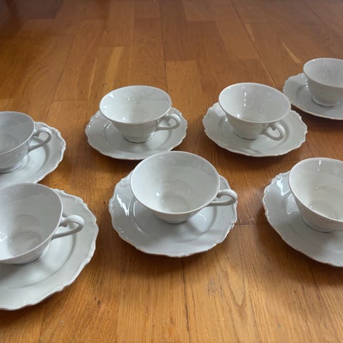 Koppar 2-pack i keramik med vit basfärg och dekorationer i blått och andra färger. Kopparna har en klassisk form med handtag och är lämpliga för servering av kaffe eller te