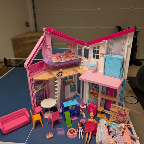 Barbie dockhus med flera våningar, rosa färg och inkluderade möbler. Dockhuset har en spiralrutschkana och olika rum för lek. Passar för barn som leksak.