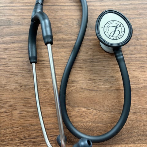 Svart stetoskop märke Littnan, används för medicinska undersökningar för att lyssna på kroppsljud. Membran och fästring medföljer separat.