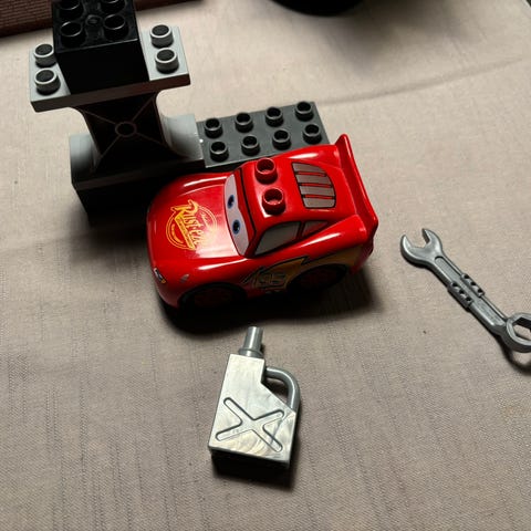 LEGO DUPLO Disney Bilar leksaksfordon med röda och svarta färger. Setet inkluderar flera byggbara delar och fordon inspirerade av Disney-filmen Bilar, anpassade för yngre barn.