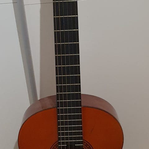 Akustisk gitarr i klassisk design med träfinish och nylonsträngar. Levereras med ett mjukt bärfodral för skydd och transport.