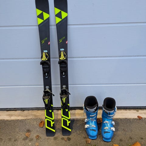 Komplett skidutrustning bestående av ett par Fischer XTR skidor med bindningar, ett par slalomstavar och ett par Nordica pjäxor. Pjäxorna är storlek 29.5. En praktisk väska medföljer för enkel transport och förvaring av pjäxorna.