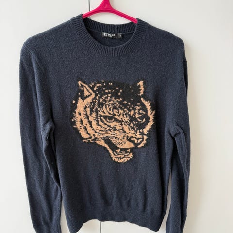 Kenzo M tröja i grå färg tillverkad i bomull. Herrmodell i storlek M med lång ärm och rund halsringning. Tröjan har en framträdande tigerapplikation på framsidan.