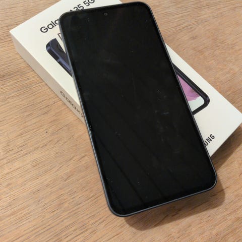 Samsung Galaxy A35 5G smartphone med 128 GB lagringsutrymme, svart färg. En mobiltelefon med Android-operativsystem, utrustad med 5G-anslutning och en frontkamera placerad i mitten av skärmen. Levereras med laddningskabel och originalförpackning.
