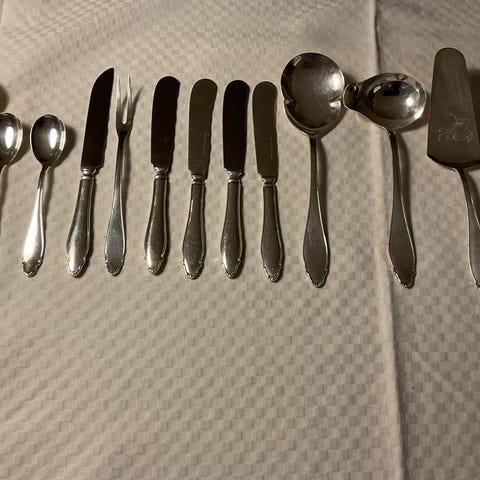 Säljer ett charmigt litet set med 4 smörknivar i nysilver tillsammans med 4 glas bordshållare. Perfekt till ostbrickan, brunchdukningen eller som komplettering till äldre nysilverserviser.