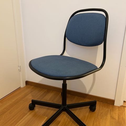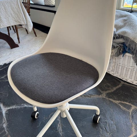 En grå höj- och sänkbar skrivbordsstol för barn med stoppad sits och rygg.