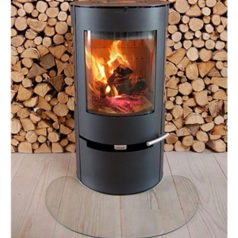 I kartong, kom aldrig till användning då vi har stengolv runt kaminen
