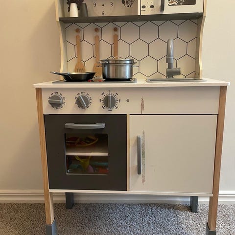 IKEA lekkök för barn i vit färg. Köket har en spishäll med två plattor, en vask med kran, ugn med dörr och förvaringsutrymme under. Framför vask och spis finns en svart griffeltavla. Köket är tillverkat i trä och är avsett för barn. (Leksaker tillkommer)