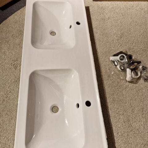 Nytt, helt oanvänt tvättställ i ett enda glasstycke. Kranar, ventiler och vattenlås medföljer, se bilder