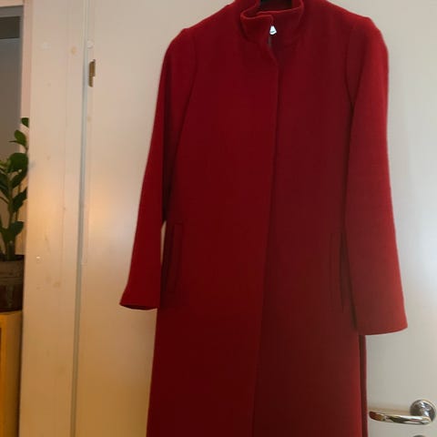 Snygg kappa från Stockh LM. Kappan har en stilren design med en hög krage och en dubbelknäppning framtill. Den har även ett avtagbart bälte i midjan. Stl 34. Fint skick!
