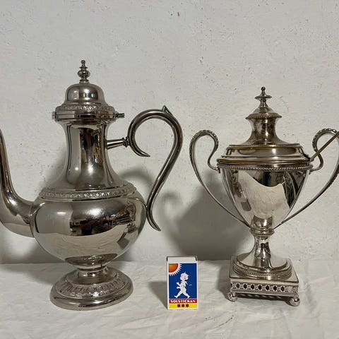 Elegant kaffekanna, sockerskål och gräddkanna i nysilver.