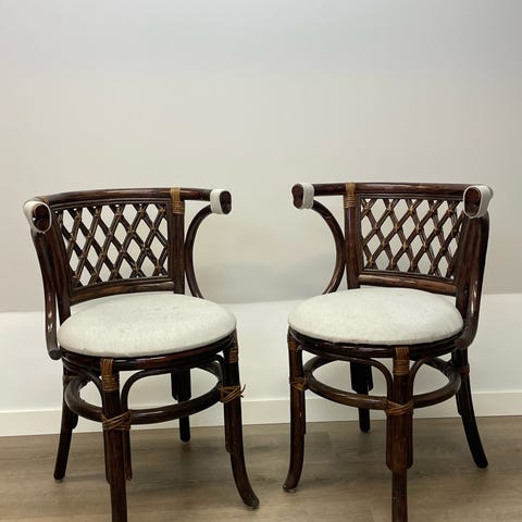Två st antika ihopfällbara stolar med underbar patina i trä och tyg i nyskick.