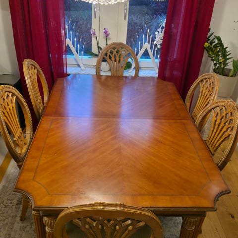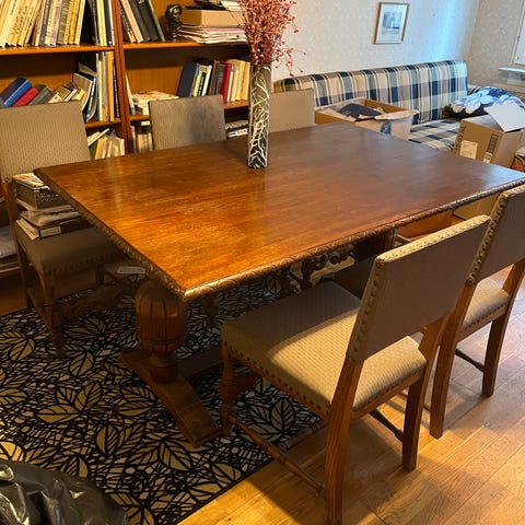 Antik matsalsgrupp med omklädda stolar och utdragbar skiva i fint skick