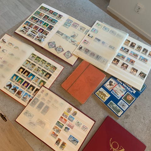 Samlade på frimärken ett tag som barn. Det va länge sen. Nu kanske någon vill addera det här till sin samling eller påbörja en samling. Samlingen är insatt i ett album för frimärken. Bilderna visar endast en del av samlingen. Totalt 16 sidor i albumet.