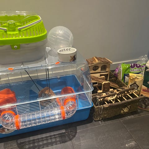 Hamsterbur i tre våningar med flera tillbehör inklusive hjul, tunnlar, trappor, små hus, leksaker, liten transportbur, komplett lekhage med sektioner av galler. Jättefint skick och allt är väl rengjort.