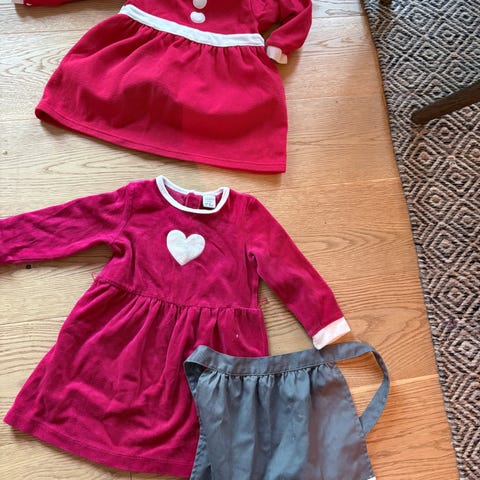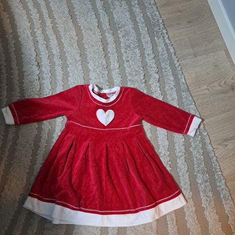 Set med julkläder för flicka i storlek 86/92. Innehåller ett lucialinne i storlek 86/92, en röd långärmad klänning med vitt hjärtmotiv storlek 92 och en röd kortärmad klänning med spetsdetaljer storlek 86.