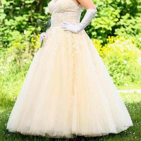 Dessutom ingår två underkjolar, så du kan själv justera hur fluffig du vill att klänningen ska vara! Perfekt för dig som är ca 161 cm lång (klänningen är några cm längre, som du kan se på bilden). Klänningen är i storlek 32.