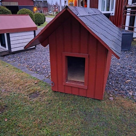 Hundkoja tillverkad i trä med ett svart tak. Passar för utomhusbruk och ger skydd för hunden/katten mot väder och vind.