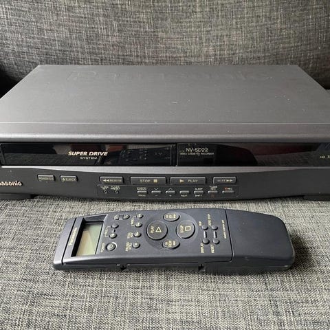 Panasonic NV-HS800EC ShowView SVHS videobandspelare med tillbehör. Inkluderar fjärrkontroll, kablar och ett antal videoband. Videobandspelaren användes i skolan.