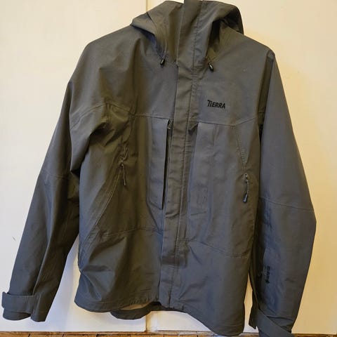 Grå/grön/svart Tierra jacka med huva. Jackan har två fickor fram och en innerficka. Dubbeldragkedja fram för ökad funktionalitet.