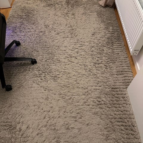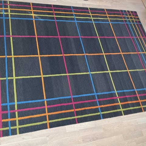 Mattan passar perfekt under både soffgruppen och matbordet tack vare sitt tåliga material. Den är i fint skick med endast lätt bruksslitage.