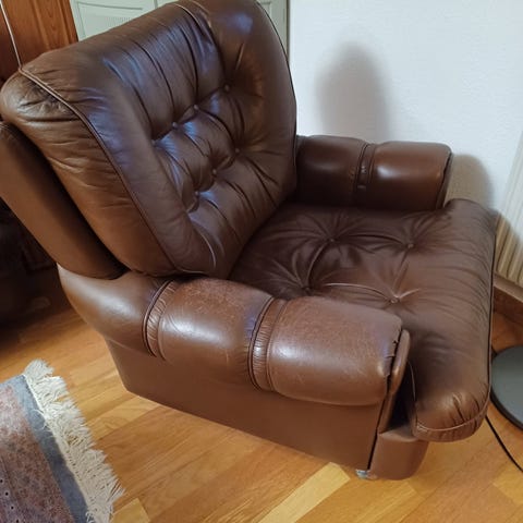 Grå soffa och fåtölj i skinn.Sitthöjd ca 44 cm.