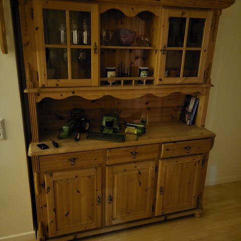 Stadigt vitrinskåp i massivt furu med tre glasluckor upptill och bra förvaring nedtill med lådor och skåp. Funktionellt och i fint bruksskick.