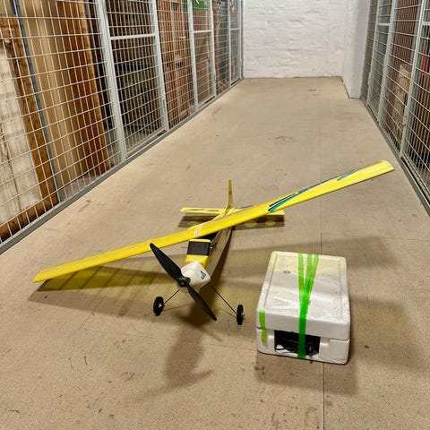 Enkel seglare ca 190 cm spännvidd 2 kanal. Balsakropp och spryglar. Ingår två äldre servon med Futaba/Hitec kontakt strömbrytare och en tillhörande batterihållare för batterier eller laddbara accar. Testade roder o servon som funkar bra. Inga skador i strukturen. Vingen har inte negativ v-form ser bara så ut på bilden. Delbar vinge och stabbe. Kan evt ta med t Österlen mot jul.
