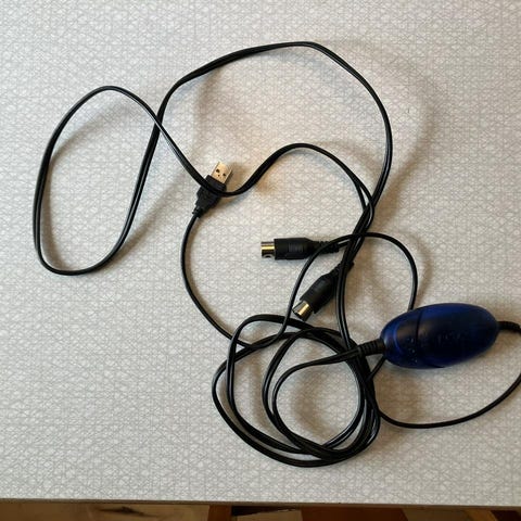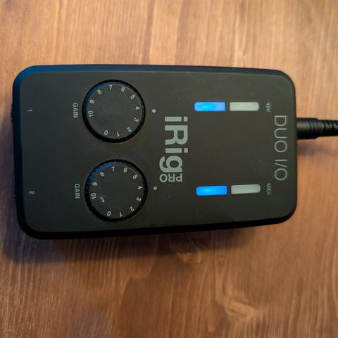 IK Multimedia iRig ljudinterface med anslutningar för hörlurar och mikrofon, USB-port för anslutning till dator eller mobil enhet, och volymkontroll. En kompakt enhet för ljudinspelning och ljudöverföring.