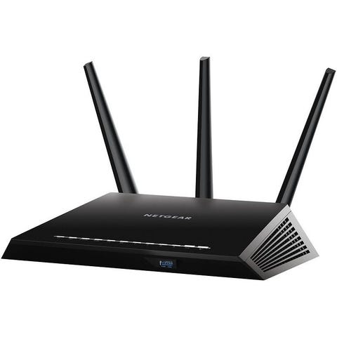 Netgear Nighthawk M1 router med skärm som visar nätverksstatus, utrustad med USB-port, USB-C-port och Ethernet-port. Enheten har en fyrkantig design med rundad display i mitten.