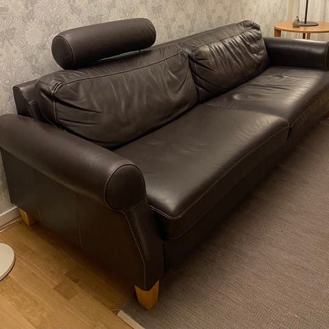 Cremefärgad skinnsoffa, har utgått ur sortimentet.