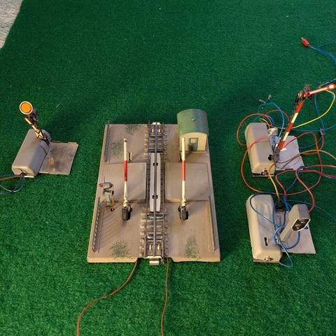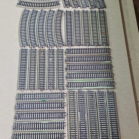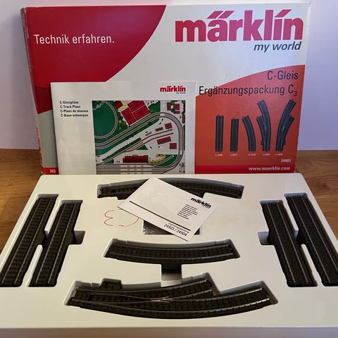 Marklin modelljärnvägsspår set med olika raka och böjda spårdelar i metall. Setet innehåller flera typer av spår för att bygga modelljärnvägslayouter. Färgen är grå och materialet är metall.