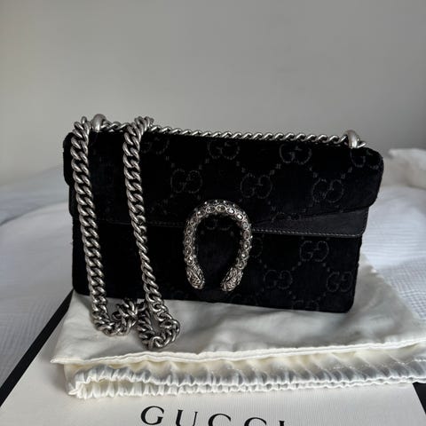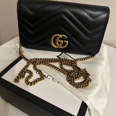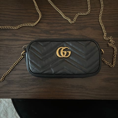 Gucci väska tillverkad i läder, designad för kvinnor. Väskan har en kedja som axelrem och flera fack för förvaring. Färgen är beige med detaljer i mörk metall.