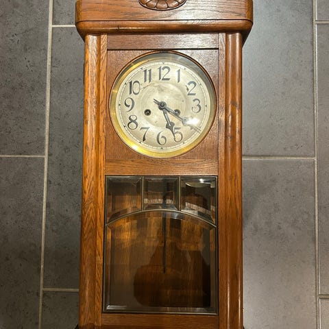 Väggklocka tillverkad i trä med glaslucka och pendel. Klockan har en rund urtavla med siffror och visare. Den har en klassisk design med dekorativa detaljer i trä och är avsedd för väggmontering.