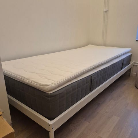 Nästan ny justerbar Viking-säng från Mio med måtten 90x200 cm i beige färg. Sängen har en justerbar funktion som gör det möjligt att höja både huvud- och fotändan. Madrassen är klädd i ett beige tyg.