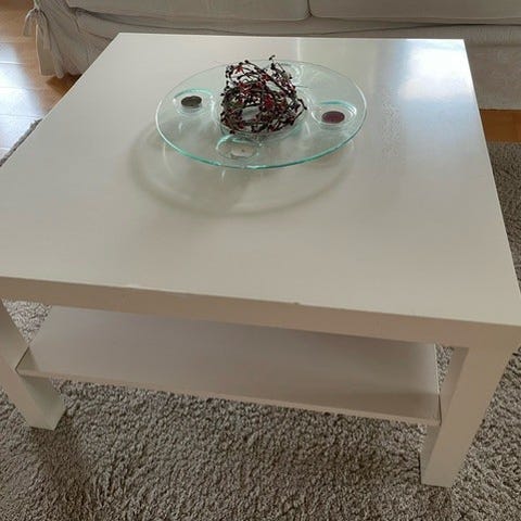 Soffbord i bra skick men med några mindre märken i skivan. Bordet har träfärgad skiva och svarta ben, det är 70 cm på mitten och 42 cm längst ut på kanterna