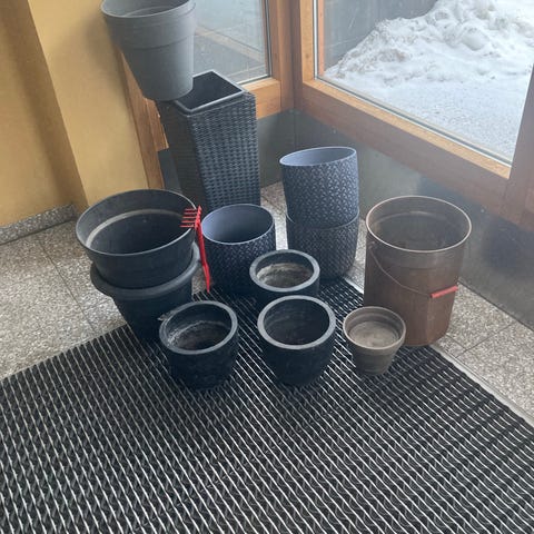 Utekrukor i olika design och storlek. Stor kruka 150 kr, mindre kruka 75 kr
