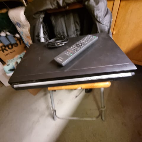 Sony DVD-spelare (RDR-GX120/S) inklusive fjärrkontroll, bruksanvisning och nätsladd. Enheten har standardanslutningar för SCART och kompositvideo (ej HDMI). Produkten är avsedd för uppspelning och inspelning av DVD-skivor.
