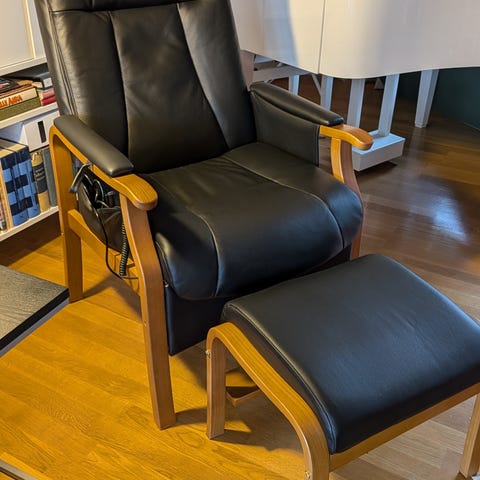 Laminofåtölj i svart skinn med tillhörande pall i bok.