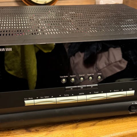 Harman Kardon AVR 45 RDS receiver med flera ingångar och utgångar för ljudanslutning. Enheten har en svart finish och är designad för hemmaljudsystem eller som slutsteg.