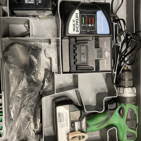 Panasonic EY6932 sladdlös skruvdragare med medföljande batteri och laddare. Borrmaskinen är svart och gul och avsedd för olika borr- och skruvuppgifter.
