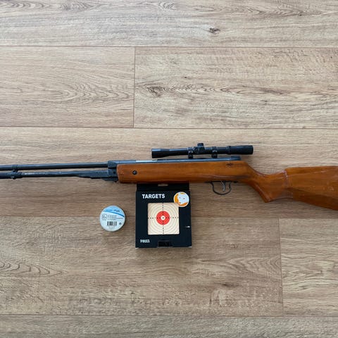 Geväret är i mycket bra skick, fungerar som den ska och läcker inte luft. Den skjuter fint och har varit sparsamt använda.