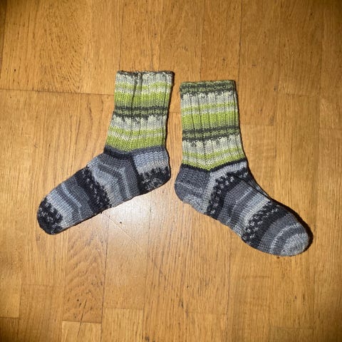 Egenstickade, hemmagjorda stickade strumpor i färgerna mörkblå, ljusblå och orange.